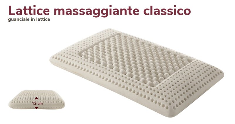 - Cuscino con superficie bugnata per un effetto massaggiante, in 100% schiuma di lattice anallergica, antibatterica e traspirante, ideale per chi preferisce un supporto più elastico e naturale.